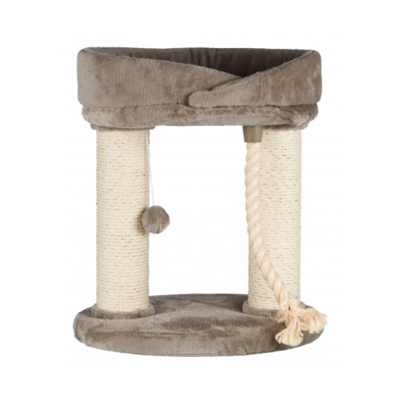 Floor area: 53 × 43 cm Post: ø 11 cm Colour: grey Height: 60 cm with plush cover posts with plush-covered caps and wrapped in natural sisal padded base plate/padded platform with removable cuddly bed cuddly bed: washable by hand with rope/with toy on string colour: grey