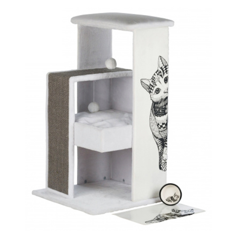 with plush cover/suede look and sisal scratching surface cuddly bed with reversible cushion: washable by hand padded platform with toys on string colour: white/grey Floor area: 58 × 58 cm Height: 101 cm