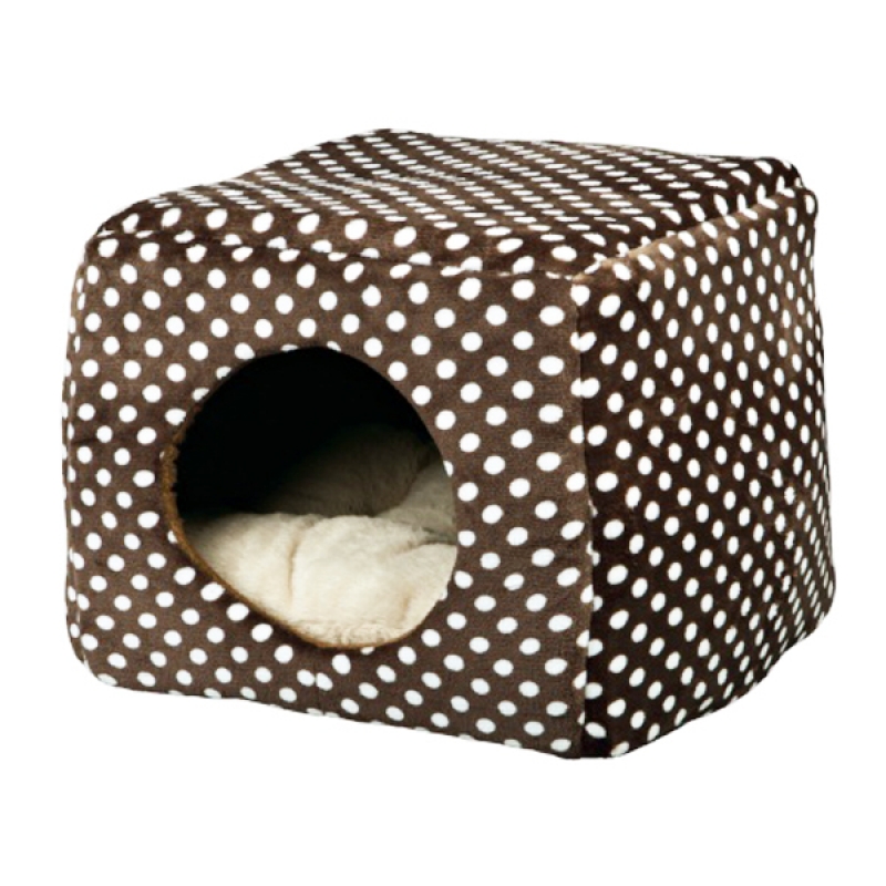 2 in 1: cave and bed soft plush cover / foam padding removable reversible cushion with polyester fleece filling easy-care bottom Measurements: 40 × 32 × 40 cm Colour: brown/beige