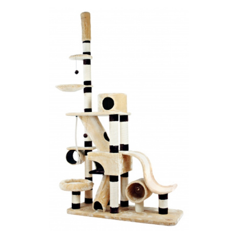 with ceiling attachment with plush cover posts with plush border and wrapped in natural sisal padded platforms caves fitted with plush with sisal scratching wave and rope with toys on string Floor area: 139 × 60 cm Height: 246-280 cm