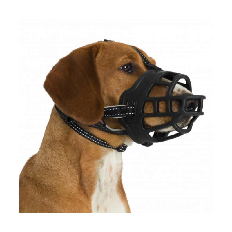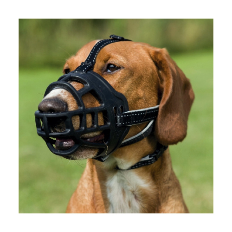 Size: S, M, M-L, L, XL, L-XL silicone/nylon/neoprene prevents biting no problems with panting, drinking and feeding treats particularly comfortable to wear due to ergonomic fit, flexible silicone that is stable in shape and neoprene-padded straps in face and neck areas secure due to threefold fastening continuously adjustable forehead strap and neck strap as well as nape loop with reflective stripes colour: black