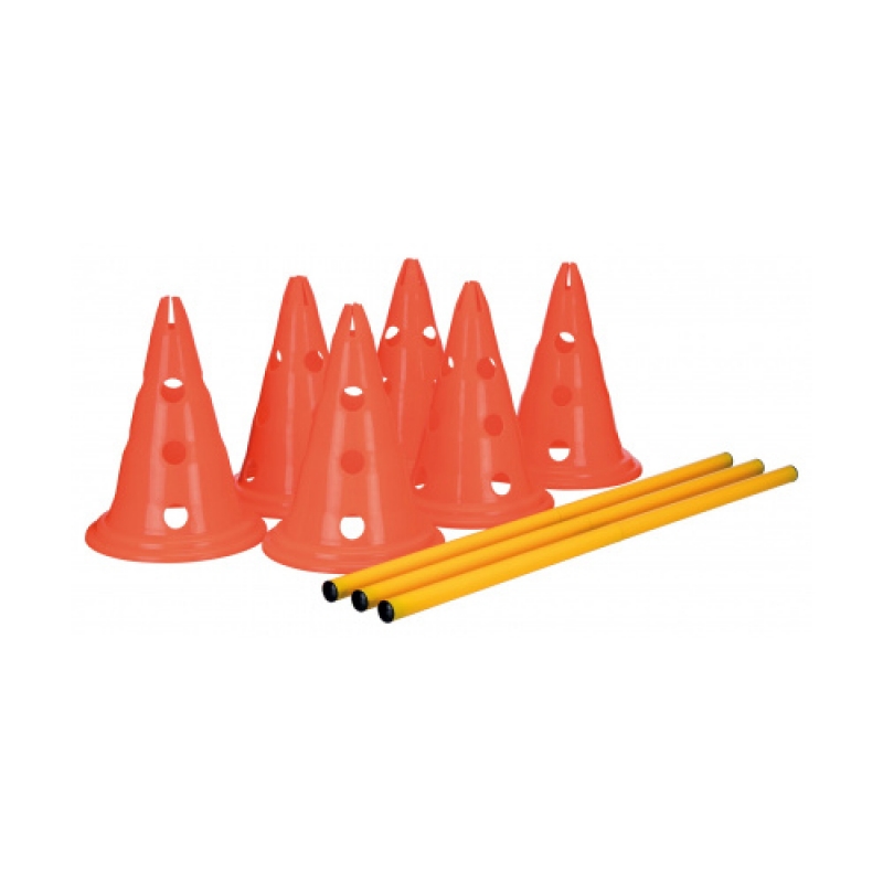 Measurements: ø 23 × 30 cm, 78 cm Contents: 6 Pylons, 3 Poles plastic to increase concentration, body awareness and coordination also suitable for (physio-)therapeutic treatment various options for putting together obstacles or slalom courses suitable for dogs of any age or size due to variable adjustment in height incl. booklet with tips and tricks for optimal training
