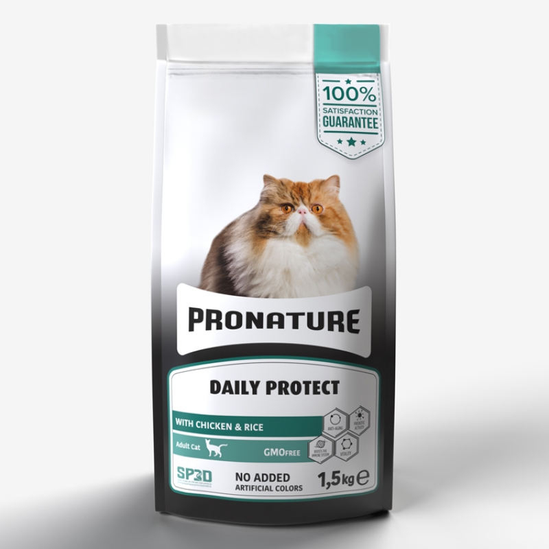 1.5 KG - 10 KG - Super Premium Food طعام بروناشور ديلي بروتيكت مصمم خصيصا للقطط البالغه من سن ١٢ شهر فما فوق، مدعم بجميع العناصر الغذائيه من الفيتامينات والبروتينات والبريبايوتيك لنمو صحي وللحفاظ على وزن الجسم الامثل لهم وتلبيه احتياجاتهم اليوميه من الطاقه والمغذيات Adult Cat Food Specially formulated for cats 12 months and older to maintain optimum body weight and meet their daily energy and nutrient requirements. Vitality Formulated with high quality animal source proteins to support your cat's fitness and muscles. Anti-Aging Effect & Natural Defence It has an anti-aging effect and strengthens the body's natural defence system with its ability to clean free radicals. Prebiotic Activity Formulated with Fructo oligosaccharides (FOS) with prebiotic activity. Digestive Support Manufactured from high quality raw materials to improve effective digestion and absorption of nutrients. CONTENT Processed Animal Protein (32% Chicken), Wheat, Chicken Oil, Corn Gluten, Processed Fish Protein, Rice (5%), Hydrolysed Animal Protein, Dried Yeast, Vegetable Fibres, Fructooligosaccharides (FOS) 0,5%, Potassium Chloride, Sodium Chloride, yucca schidigera 0,1%, products obtained by processing fruits and spices 0,05% (clove (clove), turmeric (turmeric (curcuma sp. ), citrus fruits (citrus sp.), rosemary (rosmarinus sp.), grape seeds (vitis sp.) ANALYTICAL COMPONENTS Protein: 35%, Fat Content: 14% Crude Fiber: 2%, Crude Ash: 7.2%, Calcium: 1.3%, Phosphorus: 0.7%, Magnesium: 0.09 NUTRITIOUS SUPPLEMENTS Vitamin A (3a672a) 31,000 IU/kg, Vitamin D3 (3a671) 1,850 IU/kg, Vitamin E (3a700) 300 mg/kg, L-carnitine 200 mg/kg, Iron(II) sulphate monohydrate 342 mg/kg (Iron (3b103) 112 mg/kg), Copper sulphate pentahydrate 44 mg/kg (Copper (3b405) 11.2 mg/kg), Manganese sulphate monohydrate 38,5 mg/kg (Manganese (3b503) 12,5 mg/kg), Zinc sulphate monohydrate 342 mg/kg (Zinc (3b605) 125 mg/kg), Anhydrous calcium iodate 3,4 mg/kg (Iodine (3b203) 2,2 mg/kg), Sodium selenite 0,68 mg/kg (Selenium (3b802) 0,31 mg/kg). Antioxidants FEEDING GUIDE It is recommended to start the food in the quantities indicated in the table. The daily amount is a guideline and may vary depending on the animal's activity, physiological condition and ambient temperature. Always keep fresh, clean water in front of your cat with the food. Store the food in a cool and dry place. FEEDING CHART Daily Amount (g) Cat Weight (kg) Adult Pregnant Female Cat Lactating Female Cat 2 35 45 135 4 70 90 275 6 100 135 410 8 135 180 545