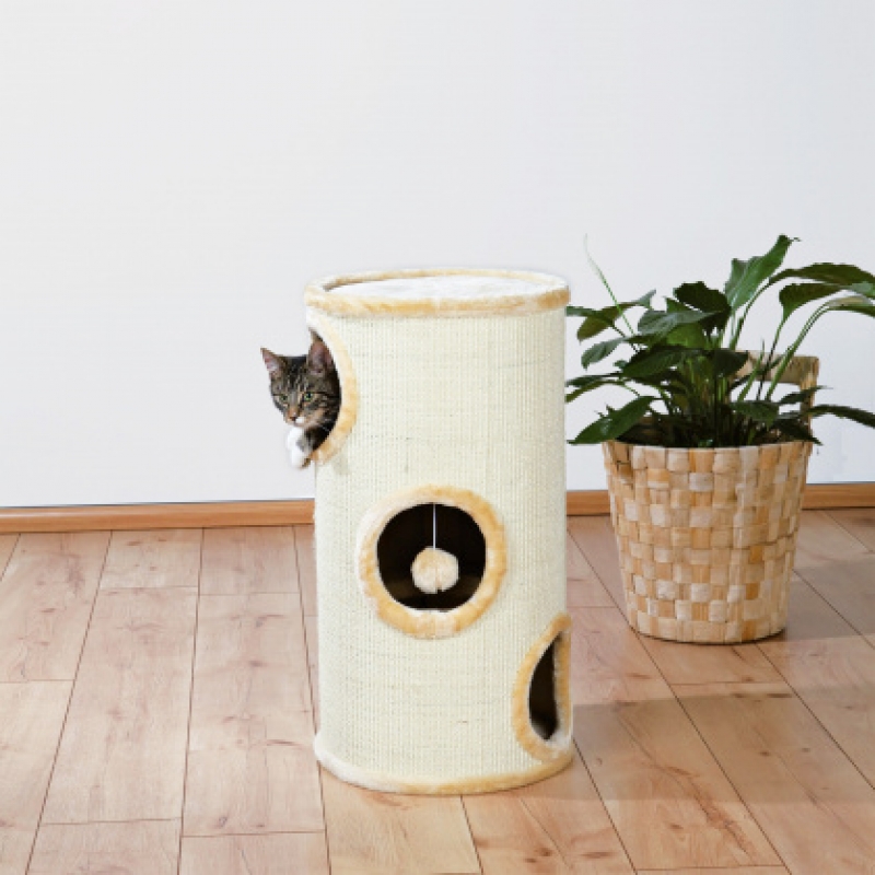 with sisal scratching surface and plush cover 3 storeys (levels 1 and 2 connected) padded platform with toy on string colour: beige Floor area: ø 36 cm Height: 70 cm