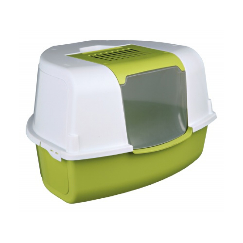 with hood, door flap and scoop activated carbon filter neutralises bad odours hinged front for easy cleaning double rim and tray with extra high rim prevent urine and litter being scattered out of the tray Easy Click clasps make it fast to open and close