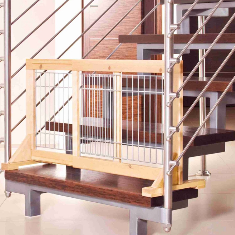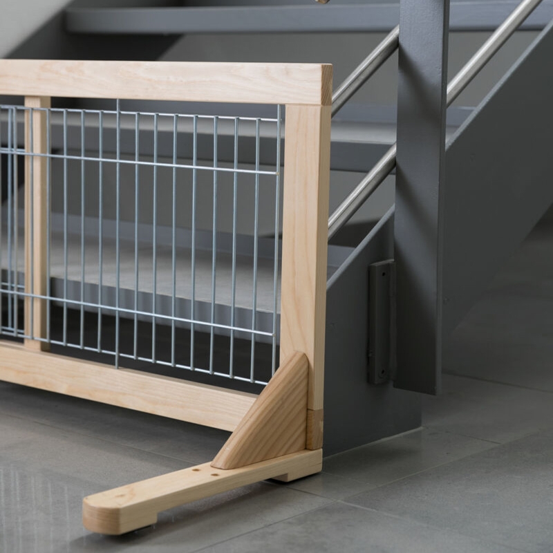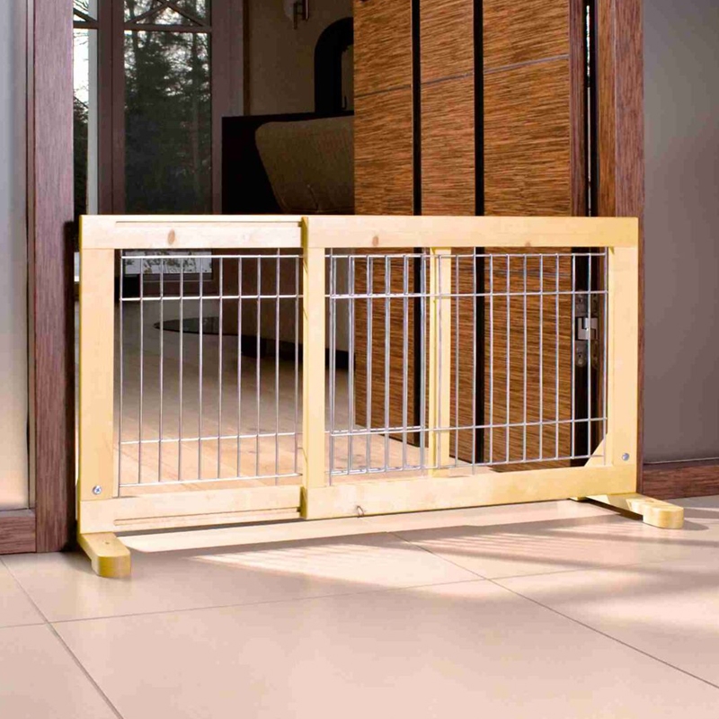 Measurements: 65-108 × 50 cm for puppies and small dogs made of pine wood with clear varnish, with galvanized bars individual use due to different positions of base fully adjustable in width non-slip due to rubber feet