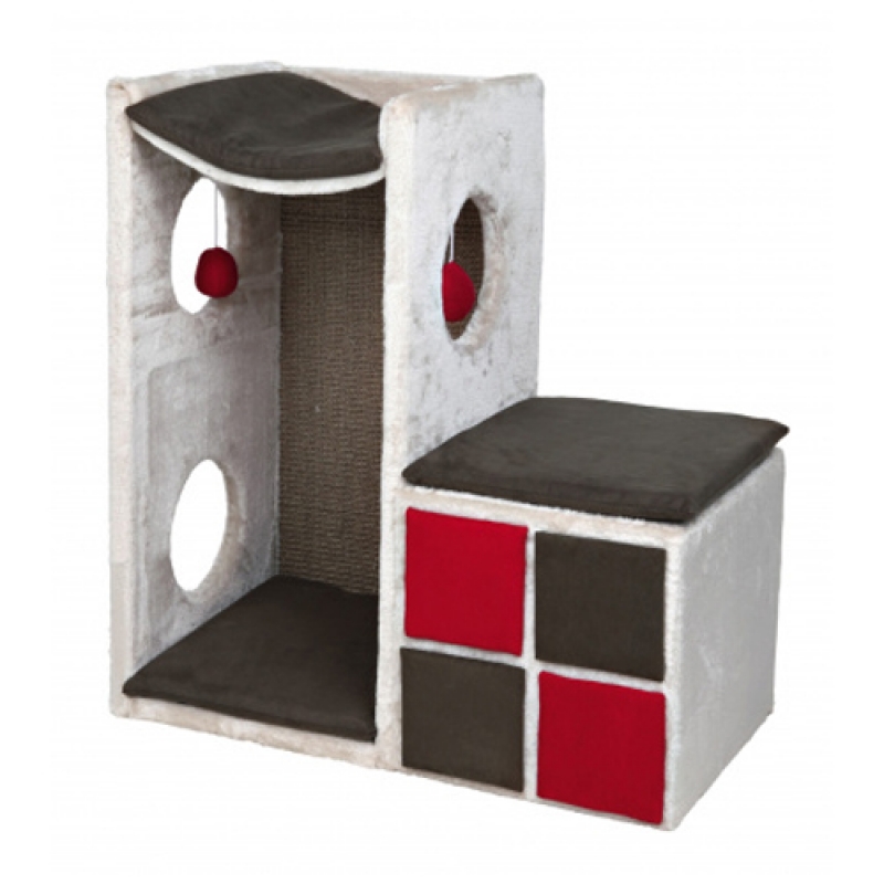 Floor area: 67 × 36 cm Height: 70 cm with plush/suede look cover and sisal scratching surface cave fitted with plush with 3 reversible cushions cushion cover: machine washable up to 30 °C/inner cushion: washable by hand with toys on string colour: light grey/grey/red