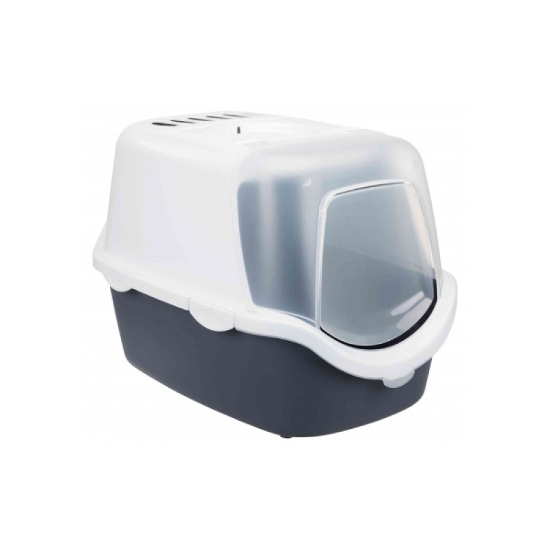 Measurements: 40 × 40 × 56 cm Height: 40 cm with hood, door flap, scoop and handle activated carbon filter neutralises bad odours hinged front for easy cleaning double rim prevents urine and litter being scattered out of the tray Easy Click clasps make it fast to open and close Color Measurements blue/white 40 × 40 × 56 cm