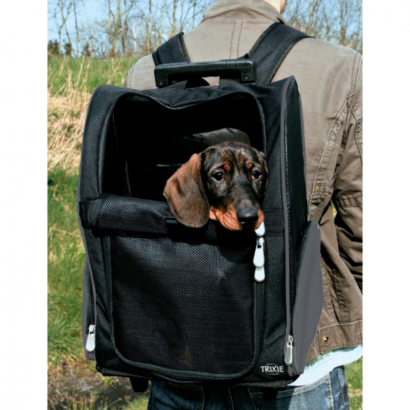 Measurements: 36 × 50 × 27 cm up to: 8 kg polyester / can also be used as a backpack safe fit and comfortable to wear due to softly padded, fully adjustable and anatomically shaped shoulder straps with compartments for keeping drinking bottle, treats etc. short leash prevents the pet from jumping out with net inserts for good air circulation flaps at the back to put a seat belt through padded bottom